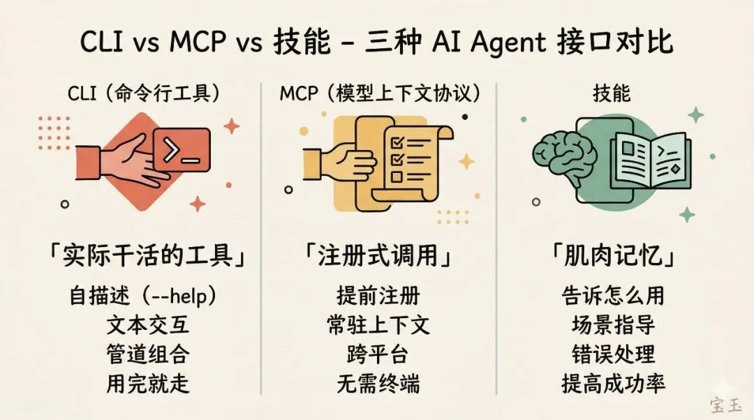 There are currently three mainstream ways to let AI Agents operate external services: MCP, CLI, and Skills. They are not mutually exclusive; each handles a different aspect.