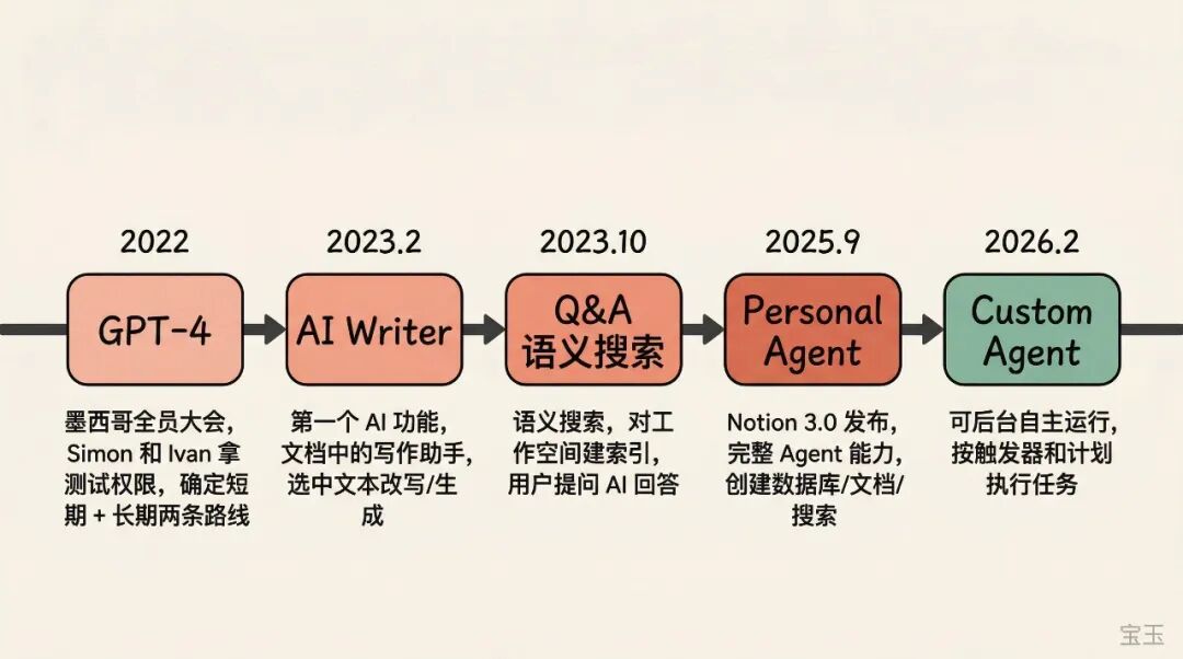 2. Notion tried three or four times before creating a usable general Agent. Personal Agent was released in September 2025, and the autonomously runnable Custom Agent was released in February 2026. -